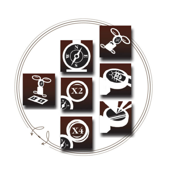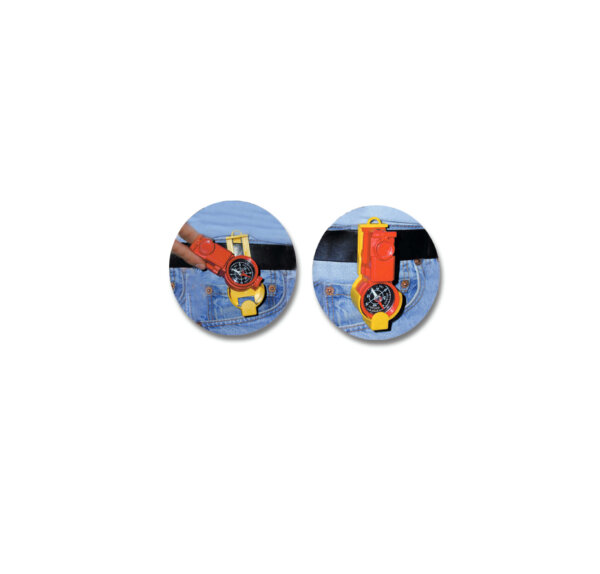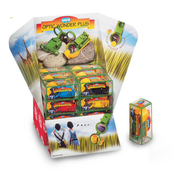 Strumento didattico multi-funzione: binocolo, lente d’ingrandimento, bussola, specchio ingranditore e piano d’osservazione, specchio per segnali e visore stereoscopico. In colore pastello.
