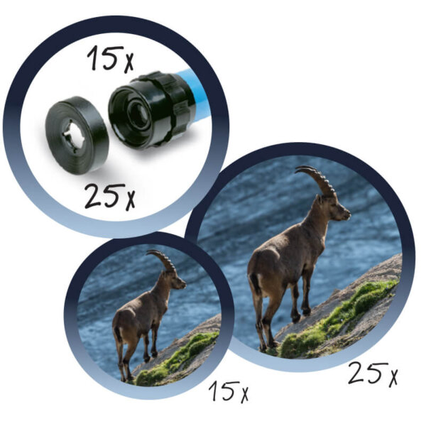 Telescpe with optics with 5 elements for aperfect view of distant objects. Supplied withocular-lens cover and tripod. Additonal lens to reach 25 magnifications